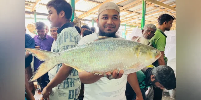 জেলে শহিদ মাঝি বলেন, ইলিশ শিকারে সমুদ্রে গিয়ে অন্যান্য মাছের সঙ্গে এ বড় ইলিশটি ধরা পড়ে। মাছটির ওজন ২ কেজি ৫০০ গ্রাম। সকালে মাছটি ফয়সাল ফিসে নিয়ে এলে নিলামে ১৪ হাজার টাকায় কিনে নেন মৎস্য ব্যবসায়ী ইশতিয়াক।