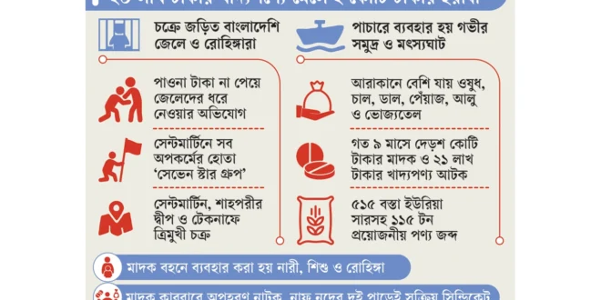 স্থানীয় গোয়েন্দা সূত্র জানায়, মিয়ানমারের রাখাইন রাজ্যে বিদ্রোহী গোষ্ঠী আরাকান আর্মি নিয়ন্ত্রণ থাকলেও খাদ্য ও ওষুধের জন্য বাংলাদেশের ওপর নির্ভরশীল। এ সুযোগ কাজে লাগিয়ে সীমান্ত এলাকার অসাধু ব্যক্তি, জেলে ও প্রভাবশালীরা সিন্ডিকেট পরিচালনা করছে। তারা মাছ ধরার নামে বাংলাদেশি পণ্য পৌঁছে দেয় এবং মাদক ফেরত আনে।