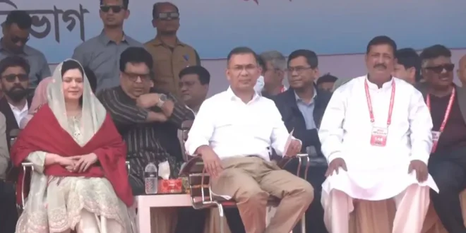 মাদ্রাসা ময়দানে প্রবেশের পর জনসভা মঞ্চে উঠে হাত নেড়ে উপস্থিত বিপুল জনতার প্রতি অভিবাদন জানান তারেক রহমান। এরপর তিনি মঞ্চে প্রধান অতিথির আসনে বসেন।